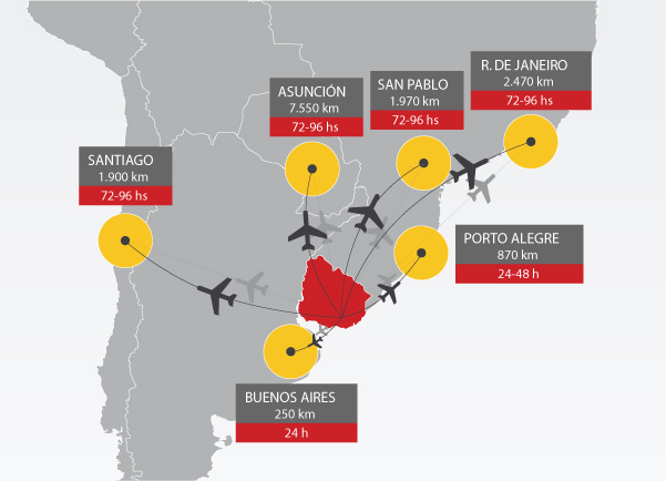 Uruguay cuenta con terminales especializadas multi-propósito (Puerto y Aeropuerto Libre) lo que permite contar con la mercadería pronta en el depósito en menos 36 hs.